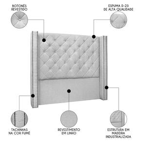 Características do Produto Material da Estrutura: Madeira industrializada. Densidade da Espuma: Espuma D-23. Revestimento: Linho. Possui Pés: Não. Possui Frame: Sim. Diferenciais: - Botonês Revestidos. - Tachinhas na cor fumê. - Espuma de alta qualidade. - Design moderno. Sistema de Montagem: O produto é enviado montado, sendo necessário apenas a fixação na cama box. Manual de Montagem: Sim. Complexidade da Montagem: Baixa. Conteúdo da Embalagem: 1 Cabeceira. Volumes: 1 Volume. Garantia do Fabricante: 90 dias contra defeitos de fabricação. Montagem: Recomendamos que seja feita por um profissional. Recomendação de limpeza: Utilize pano levemente úmido.
