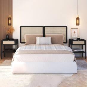 Cabeceira e 2 Mesas de Cabeceira 27977, o conjunto ideal para deixar seu quarto mais elegante. Produzido em madeira maciça Eucalipto e MDP 15 mm com acabamento BP. As mesas possuem gavetas com corrediças metálicas, puxadores em poliestireno dourado e detalhes em tela sintética (PVC) imitando palhinha, presentes também na cabeceira. Conta ainda com sapatas emborrachadas que evitam atrito com o piso. Atende aos padrões Casal e Queen Size. Produto entregue em 5 volumes.