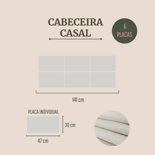 CONFIRA ABAIXO MAIS DETALHES SOBRE O PRODUTO: Tamanho Casal (6 placas): 141 cm (comprimento total) x 60cm (altura) x 3 cm (profundidade). Altura de cada placa: 30 cm Largura de cada placa: 47cm Materiais: 100% MDF; Espuma; Fita 3M; Cores e Tecidos: temos 25 variações de cores e tecidos. Escolha a que você mais gosta.