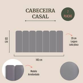 CONFIRA ABAIXO MAIS DETALHES SOBRE O PRODUTO: Tamanho Casal (7 placas): 140cm (comprimento total) x 60cm (altura) x 3 cm (profundidade). Altura de cada placa: 60 cm Largura de cada placa: 20cm Materiais: 100% MDF; Espuma; Fita 3M; Cores e Tecidos: temos 25 variações de cores e tecidos. Escolha a que você mais gosta.