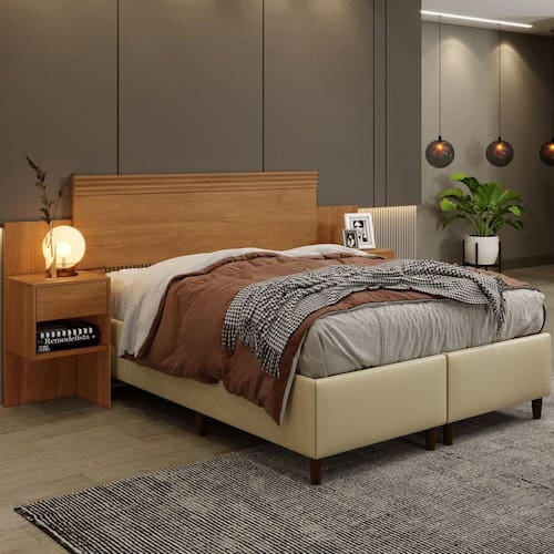 A Cabeceira Master é um móvel robusto e elegante, produzido inteiramente em chapa de 15 mm, garantindo durabilidade e resistência. Com duas mesas de cabeceira integradas, proporciona praticidade e funcionalidade ao ambiente. Além disso, conta com duas gavetas espaçosas, equipadas com corrediças telescópicas, oferecendo amplo espaço para armazenamento. Sua montagem dupla permite a adaptação a colchões de 140 cm e 160 cm, proporcionando versatilidade para diferentes tamanhos de cama. O melhor de tudo é que não necessita ser parafusada na parede, conferindo flexibilidade na disposição do ambiente. Produto Montado: Sim Acabamento da Mesa de Cabeceira: Pintura Ambiente Principal: Quarto Cabeceira Estofada: Não codigo_ean: 7909903492314 Complexidade da Montagem: Média: pode ser montado por mais de uma pessoa e/ou necessite de maior conhecimento para montagem Cor: Cinamomo Cor do Produto: Cinamomo Escala de Brilho: Fosco Escala de Brilho da Mesa de Cabeceira: Fosco Extensível: Sim Fixação Box: Não Fixação na Parede: Não Itens Inclusos: 1 Cabeceira, Kit Ferragens e Manual de Montagem Largura Máxima: 243 cm Largura Mínima: 223 cm Linha ou Coleção: Master Manual de Montagem e Instalação: https://product-hub-prd.madeiramadeira.com.br/880650/documents/66e5c061-244a-403d-997a-1cf8fc04e81e7556benetilferragemtamreal.pdf Material da Mesa de Cabeceira: MDF/MDP Material Principal: MDF/MDP Necessita Montagem: Sim Origem do Produto: Nacional Peso: 37,9 kg Possui Baú: Não Possui Mesa de Cabeceira: 02 Possui Pés: Não Possui Vidro: Não Recomendações de Uso, Manutenção e Limpeza: Limpeza com pano macio e levemente umedecido. Não utilizar solventes a base e de inflamáveis. Não utilizar produtos abrasivos. Sistema de Montagem: PARAFUSOS E CAVILHAS Tipo de Colchão: Casal
