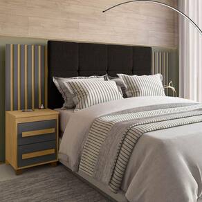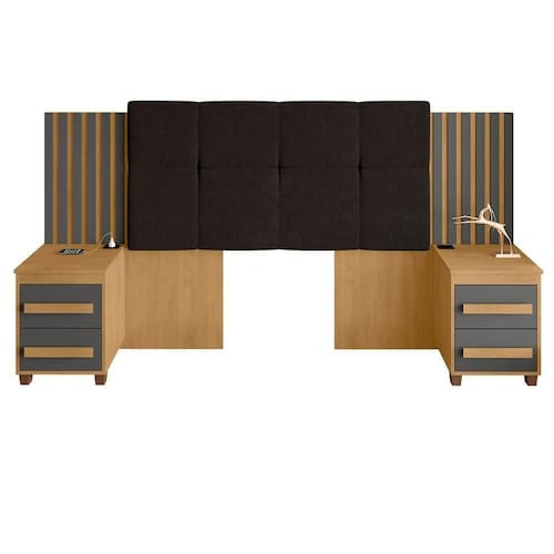 Cabeceira Casal Extensível Com 2 Mesas De Apoio Ripado E Estofado Cinamomo Com Grafite Suíça - Rv Móveis Transforme o ambiente do seu quarto com a elegante Cabeceira Extensível Suíça! Seu design contemporâneo e detalhes ripados conferem um toque de estilo refinado, perfeitamente integrado a qualquer decoração. Esta cabeceira é versátil, adaptando-se a diferentes tamanhos de box, como 1,38m, 1,58m, 1,88m e 1,98m oferecendo praticidade com suas duas mesas de cabeceira e 4 gavetas para armazenamento organizado. Os pés em PVC garantem estabilidade sem danificar o piso, enquanto os materiais de alta qualidade asseguram durabilidade e resistência ao longo do tempo. Dimensões do Produto Montado:Altura: 125 cmLargura: 290 cmProfundidade: 35 cmObservações:- Adaptável para box de 1,38, 1,58, 1,88 e 1,98m;- com Corrediças telescópicas;- Ripas Autênticas- Puxadores em MDF;- 2 Tomadas inclusas;