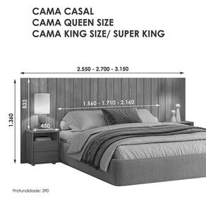 ESPECIFICAÇÕES: Estrutura em MDF Pintura UV Painel em MDF ripado angular 4 Gavetas Corrediças telescópicas Puxadores em MDF estilo cava Nichos nas mesas de cabeceiras 2 Mesas de cabeceira inclusas Moldura envoltória de 15mm Cabeceira extensiva com abertura para colchões de casal, queen e king size Pés em poliestireno de 50mm