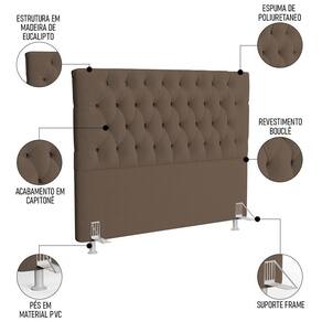 A Cabeceira Casal é uma ótima opção para quem busca conforto, beleza e qualidade. Ela é feita com madeira de Eucalipto, uma matéria-prima muito resistente, e possui um acabamento em espuma poliuretano e tecido Boucle de ótima qualidade e com detalhe em capitonê que vai deixar seu Quarto ainda mais elegante, acompanha dois pés em PVC, ideais para evitar o direto com o chão. Além disso, a Cabeceira Painel tem um design moderno e sofisticado, com costuras reforçadas e um sistema de fixação prático e , que permite que você a instale sem dificuldade fixando o frame na cabeceira e em seguida a base do no frame. Com a Cabeceira Para Cama Você vai ter um quarto mais aconchegante, organizado e charmoso.