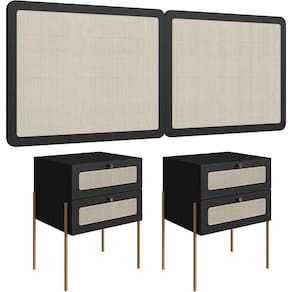 Esse o jogo de quarto combina uma cabeceira painel elegante e duas mesas de cabeceira estilo industrial, trazendo um toque moderno e estiloso para seu espaço. Com uma gaveta prática e detalhe em telinha sintética charmosa, as mesas laterais são perfeitas para manter seus pertences organizados e ao seu alcance, enquanto os pés metálicos garantem a durabilidade e a resistência que seu lar merece.