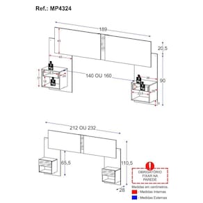 Conteúdo da Embalagem: 1 (uma) Cabeceira com 2 Mesas de Cabeceira e Espelhos Kit Ferragem Manual de Montagem