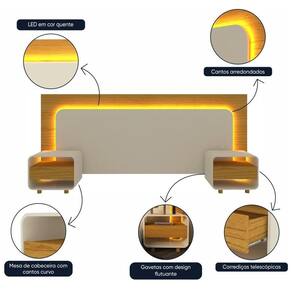 A cabeceira Innova é o móvel ideal para transformar a decoração do seu quarto. Com design curvo e LED em cor quente, traz um tom de aconchego, tranquilidade e modernidade ao seu ambiente de descanso. Possui duas mesas de cabeceira com gavetas de design flutuante e cantos arredondados. O grande destaque é a possibilidade de organizar as peças de acordo com o tamanho da sua cama, dessa forma atendendo padrões casal (140cm), queen (160cm) e king (195cm).