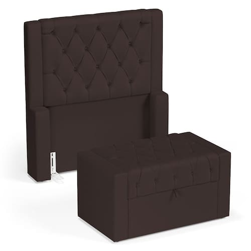 Madeira de reflorestamento, Suede, Espuma D-20, Espuma D-23, PlásticoQue tal o Conjunto de Cabeceira e Calçadeira Baú Atena?
