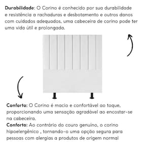 Fabricada com materiais de alta qualidade, como madeira eucalipto e revestimento em Corino, esta cabeceira é durável e resistente, garantindo não apenas estilo, mas também funcionalidade para o seu ambiente.