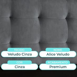 Cabeceira Estofada Casal Alice Nature Veludo Grafite 138x136 Cabeceira casal com 136cm de altura, ideal para compor um quarto sofisticado Revestida em veludo, com textura aveludada e toque macio de alto padrão