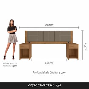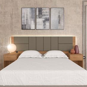 A Cabeceira Dubai com mesas laterais une praticidade e conforto. O grande destaque é o painel almofadado trazendo modernidade e beleza.Detalhes Técnicos:Medidas da Cabeceira montada: A:121,5cm | L:240cm | P:45cmMateriais de Fabricação:- Chapa MDP 15mm- Revestimento: Pintura UV-Tonalidade: Carvalho americano-Tonalidade do tecido : Suede Capuccino- Corrediça MetálicaAcompanha : Led e tomadas de energia (tomada para produtos de baixa potência)- Sapatas plásticas-Medida para cama: 158cm- Estruturado com material de altíssima qualidade, evitando fungos e mofo.Conteúdo da Embalagem:- 01 Cabeceira- Plástico protetor- Caixa papelão- Acessório para Montagem: Cavilhas, Parafusos, Sache de cola, Etiqueta, Tapa furo.Observações Importantes:- As imagens ambientadas são meramente ilustrativas e podem apresentar itens que não incorporam o produto;- Todos os nossos produtos são novos, acompanham documento fiscal e possuem garantia de 3 meses, essa garantia cobre somente defeitos de fabricação;- A entrega só será efetuada no endereço do CEP, caso o endereço seja diferente do CEP informado no pedido, a entrega terá cobrança adicional e o comprador arcará com as despesas;- Não realizamos entregas para zonas rurais, via caminhos fluviais e distritos, por isso não aceitamos CEP GERAL da região;- Não é possível realizar o agendamento de entrega do produto, é necessário que acompanhe o rastreio de seu pedido para saber a previsão de entrega;- As entregas somente serão realizadas para um responsável maior de idade (+18);- Enviamos para diversos estados, sendo assim nossas entregas são realizadas por transportadoras parceiras de nossa empresa. Confira as dimensões antes da compra e certifique-se de que o produto passará por elevadores, portas e corredores já que nossa entrega não inclui a subida de lances de escada, transporte por elevador e o lançamento de produtos, em caso de condomínios residenciais a entrega é feita somente até a portaria. Todas as entregas são realizadas em dias e horários comerciais;- Ao receber os seus produtos observe se a embalagem se encontra em perfeitas condições. Se você adquiriu algum móvel, confira atentamente a quantidade de volumes e o aspecto físico das embalagens. Confira também se a cor do móvel está de acordo com o seu pedido;- O prazo de cancelamento por arrependimento é de até 7 dias corridos a contar da data de recebimento;- Os produtos e assistências são enviados DESMONTADOS, MONTAGENS E DESMONTAGENS recomendamos sempre a contratação de um montador profissional e é válido lembrar que o custo desses serviços é por conta do comprador;- Objetos decorativos que aparecem na foto não acompanham o produto;- Evitar a exposição direta à luz solar e à umidade;- Para limpeza, limpar com pano macio e seco, não utilizar qualquer outro tipo de produtos químicos;- As cores do produto podem variar de acordo com o monitor, a iluminação do ambiente ou sua percepção visual;