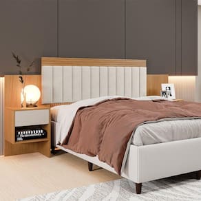Cabeceira Extensiva Estofada Com 2 Mesas De Cabeceira Master Cinamomo Off Cabeceira Master Estofada: Modernidade e Flexibilidade A Cabeceira Master Estofada e produzida em chapa de 15 mm, garantindo robustez e durabilidade. Ela inclui 2 mesas de cabeceira e 2 gavetas com corredicas telescopicas, oferecendo bastante espaco para armazenamento. Com montagem dupla, e compativel com colchoes de 140 cm e 160 cm, sem necessidade de parafusar na parede. O acabamento em tecido linho adiciona um toque de modernidade e flexibilidade ao seu ambiente.