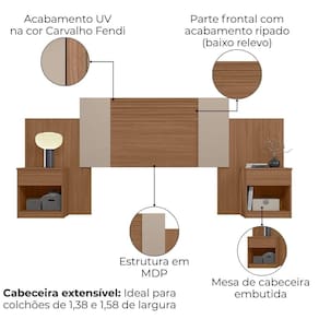 Cabeceira Extensível Araguaia alia praticidade e sofisticação para complementar seu quarto com funcionalidade. Estrutura em MDP (15 mm / 12 mm) com acabamento em pintura UV. Conta com 2 mesas de cabeceira integradas (1 gaveta cada, com corrediças telescópicas e nicho). Modelo extensível, compatível com colchões de 1,38 m e 1,58 m de largura, além de sapatas plásticas para maior estabilidade. Este produto será entregue em 02 volumes.