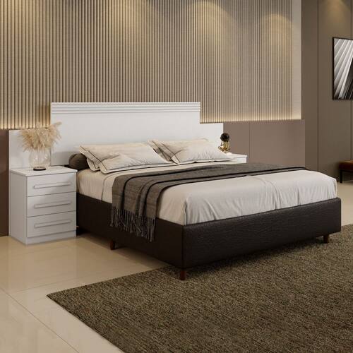Características: Estrutura em MDP 2 Mesas de cabeceira 6 Gavetas Indicada para colchão: de 140 cm -casal padrão- e 160 cm -queen size-, Corrediças telescópicas Detalhes frisados Puxadores em madeira na mesma tonalidade do produto Obs.: Não acompanha cma nem colchão.