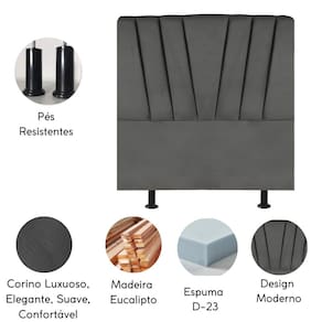 Estrutura: Madeira Eucalipto de alta qualidade Tecido: Corino Espuma: D-23 Material dos pés: Plástico Não acompanha o kit frame Os parafusos para fixação do frame e os pés serão enviados dentro do forro, na parte de trás da cabeceira Montagem: O produto vai montado, necessitando apenas rosquear os pés (2) Instruções de Limpeza: Utilizar um pano limpo e levemente úmido Você irá receber: 01 volume