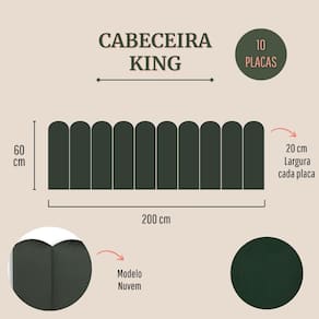CONFIRA ABAIXO MAIS DETALHES SOBRE O PRODUTO: Tamanho King (10 placas): 200cm (comprimento total) x 60cm (altura) x 3 cm (profundidade). Altura de cada placa: 60 cm Largura de cada placa: 20cm Materiais: 100% MDF; Espuma; Fita 3M; Cores e Tecidos: temos 25 variações de cores e tecidos. Escolha a que você mais gosta.