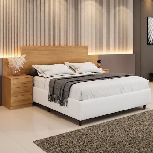 O design completo inclui duas mesas de cabeceira acopladas, cada uma com 3 gavetas espaçosas e corrediças telescópicas, proporcionando ótimo aproveitamento de espaço para organizar objetos pessoais com praticidade.