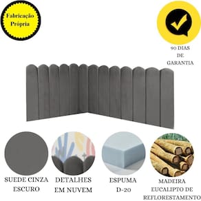 Material: Estrutura em Madeira Eucalipto com revestimento Suede de alta qualidade e espuma D–20 Conforto: Acolchoamento espesso proporcionando suporte adicional Instalação: Fixação na parede com kit de montagem incluído Instruções de Limpeza: Utilizar um pano limpo e levemente úmido Você irá receber: 01 volume