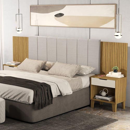 Cabeceira Elena 140/160 vai deixar seu quarto luxuoso, seus detalhes modernos são incriveis, as mesas de cabeceira contem 1 gavetas com seu designer com pés garante facilidade pra limpar o chão, e tem um nicho para livros caso você goste de ler.