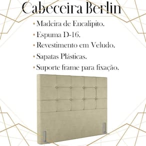 Cabeceira Queen 158 cm Berlin Veludo, ideal para inovar o seu quarto com toque luxuoso e ao mesmo tempo refinado. Estrutura em madeira de eucalipto, que oferece maior durabilidade ao produto. Composta por revestimento em tecido veludo, conta com espuma D-16 de altíssima qualidade, sapatas plásticas e acompanha frames para facilitar a fixação no box, é ideal para colchão Queen de 158 cm. Unindo elementos do design contemporâneo, que proporcionam uma ambientação moderna e com acabamentos sofisticados. Este móvel chegará na sua casa separado em 01 volume.