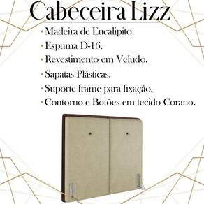 Cabeceira Queen 158 cm Lizz Veludo, é a escolha certa para você que busca conforto e modernidade, tornando o seu quarto muito mais versátil e sofisticado. Estrutura em madeira de eucalipto, que oferece maior durabilidade ao produto. Composta por revestimento em tecido veludo, contorno e botões em tecido corano, conta com espuma D-16 de altíssima qualidade, sapatas plásticas e acompanha frames para facilitar a fixação no box, é ideal para colchão Queen de 158 cm. Com design que proporciona elegância, charme e luxuosidade ao seu quarto. Este móvel chegará na sua casa separado em 01 volume.