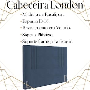 Cabeceira Queen 158 cm London Veludo, ideal para inovar o seu quarto com toque luxuoso e ao mesmo tempo refinado. Estrutura em madeira de eucalipto, que oferece maior durabilidade ao produto. Composta por revestimento em tecido veludo, conta com espuma D-16 de altíssima qualidade, sapatas plásticas e acompanha frames para facilitar a fixação no box, é ideal para colchão Queen de 158 cm. Unindo elementos do design contemporâneo, que proporcionam uma ambientação moderna e com acabamentos sofisticados. Este móvel chegará na sua casa separado em 01 volume.