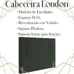 Cabeceira Queen 158 cm London Veludo, ideal para inovar o seu quarto com toque luxuoso e ao mesmo tempo refinado. Estrutura em madeira de eucalipto, que oferece maior durabilidade ao produto. Composta por revestimento em tecido veludo, conta com espuma D-16 de altíssima qualidade, sapatas plásticas e acompanha frames para facilitar a fixação no box, é ideal para colchão Queen de 158 cm. Unindo elementos do design contemporâneo, que proporcionam uma ambientação moderna e com acabamentos sofisticados. Este móvel chegará na sua casa separado em 01 volume.