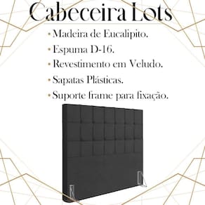 Cabeceira Queen 158 cm Lots Veludo, é a escolha certa para você que busca conforto e modernidade, tornando o seu quarto muito mais versátil e sofisticado. Estrutura em madeira de eucalipto, que oferece maior durabilidade ao produto. Composta por revestimento em tecido veludo, conta com espuma D-16 de altíssima qualidade, sapatas plásticas e acompanha frames para facilitar a fixação no box, é ideal para colchão Queen de 158 cm. Com design que proporciona elegância, charme e luxuosidade ao seu quarto. Este móvel chegará na sua casa separado em 01 volume.
