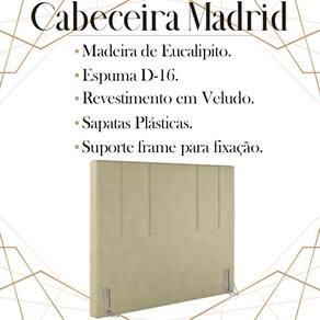 Cabeceira Queen 158 cm Madrid Veludo, ideal para inovar o seu quarto com toque luxuoso e ao mesmo tempo refinado. Estrutura em madeira de eucalipto, que oferece maior durabilidade ao produto. Composta por revestimento em tecido veludo, conta com espuma D-16 de altíssima qualidade, sapatas plásticas e acompanha frames para facilitar a fixação no box, é ideal para colchão Queen de 158 cm. Unindo elementos do design contemporâneo, que proporcionam uma ambientação moderna e com acabamentos sofisticados. Este móvel chegará na sua casa separado em 01 volume.