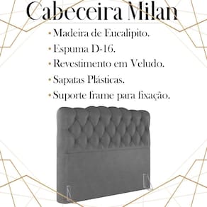 Cabeceira Queen 158 cm Milan Veludo, é a escolha certa para você que busca conforto e modernidade, tornando o seu quarto muito mais versátil e sofisticado. Estrutura em madeira de eucalipto, que oferece maior durabilidade ao produto. Composta por revestimento em tecido veludo, conta com espuma D-16 de altíssima qualidade, sapatas plásticas e acompanha frames para facilitar a fixação no box, é ideal para colchão Queen de 158 cm. Com design que proporciona elegância, charme e luxuosidade ao seu quarto. Este móvel chegará na sua casa separado em 01 volume.