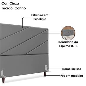 Definição de conforto a Cabeceira Queen Cristal foi desenvolvida para agregar mais modernidade e aconchego ao quarto! Com estrutura em Madeira de Eucalipto (reflorestada) e estofada em espuma (densidade D-18), conta com revestimento em tecido Corino (material sintético que lembra couro) e detalhe Diagonal na costura. Incluso Frame (metal resistente com reforço lateral e acabamento em pintura epóxi) para fixação em camas Box e pés em madeira maciça (12 cm). Pode haver variação no design do frame dependendo do lote de peças. A função do acessório e usabilidade permanece a mesma. Este produto será entregue em 1 volume.