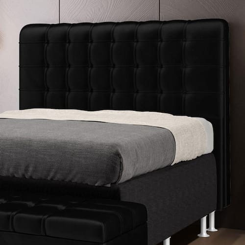 A Cabeceira Rana possui um design soft e delicado, perfeita para pessoas com um estilo mais moderno. Possui detalhes em botões e plaquetas laterais decorativas, tudo isso com um ótimo custo benefício. Possui dois pés de 12 cm e 2 frames para a sustentação do box, não sendo necessário furar a sua cama, apenas encaixa-la nos suporte da cabeceira. Adquira já!Dimensões do ProdutoLargura: 195 cmAltura: 124 cmProfundidade: 18 cmPeso: 25 KgDimensões do Produto EmbaladoLargura: 197 cmAltura: 114 cmProfundidade: 19 cmPeso: 27 KgCaracterísticas do Produto:Madeira de eucalipto proveniente de reflorestamentoFixação com grampos galvanizadosEspuma Poliuretano D20Revestimento: VeludoCor: PretoTamanho: King para cama box de 193 cmPossui pés: SimTipo de pés: 2 pés 12 cmEmbalagem: plástico bolha, papelão ondulado, malha, plásticoFixação diretamente no box através de framesGarantia de 3 meses contra defeitos de fábrica.