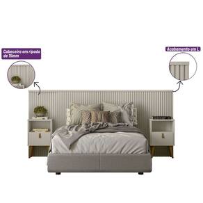 Feita em MDP e MDF com acabamento fosco, a cabeceira está disponível nas cores Off White, Carvalho e Freijó, adaptando-se a qualquer estilo de decoração. Suas dimensões de 1,33m de altura e 2,41m de largura criam uma presença marcante, enquanto as mesas laterais oferecem gavetas com corrediças telescópicas para armazenamento.