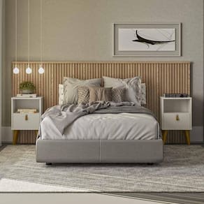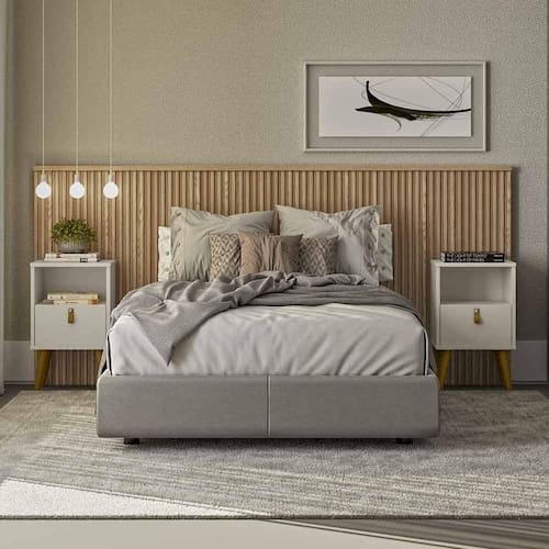 - Conjunto inclui uma cabeceira ripada e 2 mesas de cabeceira