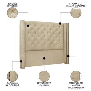 Com sua estrutura feita de madeira industrializada, espuma D23, e os frames para fixação na cama ela proporciona um suporte firme e confortável. O revestimento em linho da Cabeceira Capitonê adiciona uma textura rica e sofisticada, enquanto os detalhes em tachinhas nas laterais criam um visual clássico e atemporal. Não só serve como um ponto focal estético, mas também como uma promessa de conforto e beleza duradouros. O design da Cabeceira Estofada é pensado para complementar a decoração do quarto, adicionando um charme especial que remete à grandiosidade e ao luxo dos tempos antigos.