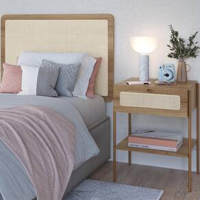 Cabeceira e Mesa de Cabeceira 28975, o conjunto ideal para tornar seu quarto mais elegante. Estrutura em tubo metálico de aço com acabamento em pintura epóxi dourada e MDP 15 mm com acabamento BP. Mesa de cabeceira com gaveta em corrediças metálicas, puxadores em poliestireno dourado e detalhes em tela sintética (PVC) que imita palhinha. Conta ainda com ponteiras plásticas para proteger o piso. Produto entregue em 3 volumes.