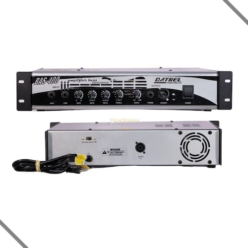 Modelo: BAS-400 Potência: 400 W 4 Ohms Canais de Entrada: 02, sendo: 1 HIGH: P10 Contra Baixo Passivo 2 LOW: P10 Contra Baixo Ativo Sensibilidade de Entrada: LOW e HIGH Canais de Saída: 03, sendo: 1 PHONE: Fone de Ouvido P10 STEREO ; 2 LINEOUT: XLR Balanceada e 3 Caixa Passiva: 01 SPEAKON BAS-4X10 ou BAS-1X15 DATREL no painel traseiro Equalização Ativa: 03 Vias, sendo: 1 LOW; MID e HIGH