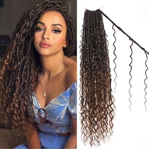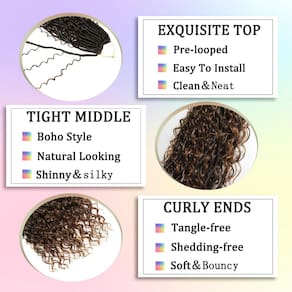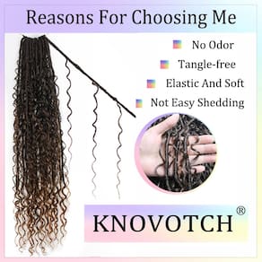 Boho Faux Locs Crochet Hair: Goddess Locs Crochet Hair com pontas encaracoladas como cabelo humano - 1. Pacote: 8 pacotes por lote, 10 fios por pacote, 3 cachos como cabelo humano por fio. Normalmente, 7 pacotes são suficientes para uma cabeça inteira. - 2. Características: cada fio de cabelo de crochê Goddess Locs apresenta três cachos como cabelo humano para um visual completo, natural e bonito. Cada Boho Faux Loc é pré-enrolado para facilitar a instalação de crochê. - 3. Material: Tecnologia de fibra química atualizada, crochê Boho Goddess Locs com o toque encaracolado macio como cabelo humano. Sem cheiro, sem emaranhados, sem queda, textura macia, hipoalergênico. - 4. Garantia: nosso cabelo de crochê macio Goddess Locs oferece uma melhor experiência. Se você não estiver completamente satisfeito com nossos falsos Locs Bohemian River, para obter ajuda. - 5. Estilo: O cabelo de crochê Goddess Bohemian Locs apresenta cachos profundos, deixando seu cabelo mais cheio. Com várias atualizações, é mais leve, mais amigo da pele e mais natural. Seja para um dia da semana, encontro, casamento, Natal, Halloween ou outras ocasiões especiais, você será o centro das atenções!
