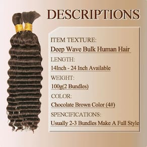 Cabelo humano a granel para trançar textura: cabelo humano a granel ondulado profundo para trançar marrom chocolate, cabelo humano trançado para tranças Material do cabelo humano ondulado profundo: 100% cabelo humano virgem brasileiro não processado, macio e saltitante, fácil de tingir e estilizar Cor do cabelo humano encaracolado: cor preta natural em estoque, pode ser tingido para a maioria das cores Comprimento do cabelo trançado humano a granel profundo: 35-61 cm pode estar disponível, pode ser comprado em diferentes combinações de comprimento Qualidade das extensões de cabelo humano trançadas: 12A cabelo humano de alta qualidade, o cabelo humano molhado e ondulado é durável - Especificações do volume de ondas profundas: (50 g/1 pacote) e (100 g/2 pacotes) podem ser escolhidos, 35 a 61 cm disponíveis, você pode escolher a quantidade e o comprimento deles de acordo com o penteado que deseja obter (mais pessoas optam por comprar 100 g + 50 g) - Qualidade de cabelo humano a granel ondulado: 12A 100% extensões de cabelo humano virgem brasileiro não processado para trançar, sem trama de ondas profundas, sem queda, sem emaranhamento, macio e saltitante, fácil de trançar - Comprimento real e cor do cabelo humano trançado: #1B, #Chocolate Brown,#27,#30,#P4/27 em estoque, fácil de tingir para a maioria das cores. 35 a 61 cm podem estar disponíveis, todos podem escolher combinações de comprimento e cor de tinta de acordo com diferentes necessidades de estilo - Longa duração do cabelo humano encaracolado profundo: com base no material de cabelo humano de alta qualidade 12A, o cabelo humano molhado e ondulado é durável de forma justa. Pode manter a textura de ondas profundas por um longo tempo - Uma ampla variedade de estilos de uso com volume de ondas profundas: sem trama de cabelo humano para trançar marrom chocolate, pode ser utilizado para fazer tranças boêmias, tranças sem nós, tranças e assim por diante. Adequado para encontros, viagens, formatura e aniversário
