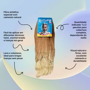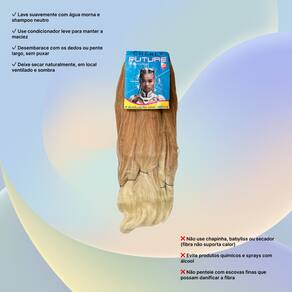 Cabelos Future Jumbo 330g Fibra Sintética Para Tranças Box BraidsFibra sintética especial, o cabelo vai solto no estilo fio a fio pronto para ser aplicado e trançado,este modelo é ideal para tranças soltas, enraizadas, crochet braids, twist, box braids, alongamento entrelaçado e outros métodos de penteados.Especificações:Material: Fibra SintéticaMarca: ChereyPeso líquido: 330 gramasEstilo: Trança/Trançado/DreadTamanho: 60cmMétodo: Tranças enraizadas, crochet braids, twist, box braids, alongamento entrelaçadoNão aceita Quimica nem Temperatura por ser um cabelo sintético.Recomendações e Cuidados:* Lave e passe condicionador normalmente* Desembarace o cabelo com cuidado antes de lavar* Não esfregue ou torça o cabelo com força* Adicione shampoo suave a água morna e mexa o cabelo até limpar*Tire o excesso de água com uma toalha e deixe o cabelo secar naturalmente* Não escove os cabelos encaracolados* Penteie suavemente com os dedos
