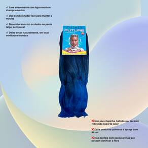 Cabelos Future Jumbo 330g Fibra Sintética Para Tranças Box BraidsFibra sintética especial, o cabelo vai solto no estilo fio a fio pronto para ser aplicado e trançado,este modelo é ideal para tranças soltas, enraizadas, crochet braids, twist, box braids, alongamento entrelaçado e outros métodos de penteados.Especificações:Material: Fibra SintéticaMarca: ChereyPeso líquido: 330 gramasEstilo: Trança/Trançado/DreadTamanho: 60cmMétodo: Tranças enraizadas, crochet braids, twist, box braids, alongamento entrelaçadoNão aceita Quimica nem Temperatura por ser um cabelo sintético.Recomendações e Cuidados:* Lave e passe condicionador normalmente* Desembarace o cabelo com cuidado antes de lavar* Não esfregue ou torça o cabelo com força* Adicione shampoo suave a água morna e mexa o cabelo até limpar*Tire o excesso de água com uma toalha e deixe o cabelo secar naturalmente* Não escove os cabelos encaracolados* Penteie suavemente com os dedos