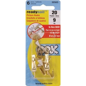 Facilite a suspensão de fotos com o ReadyNail. Este novo produto tem o prego pré-inserido no gancho no ângulo adequado. Tudo o que você precisa fazer é bater na parede. Não há necessidade de equilibrar as unhas no gancho ou machucar os dedos com o martelo. 6 peças suportam até 20 libras de capacidade. As unhas sem usar as mãos são reutilizáveis. Eles não danificarão as paredes. Ganchos e pregos banhados a latão. Os pregos são reforçados no cotovelo do gancho para maior suporte. Ideal para superfícies de drywall e drywall