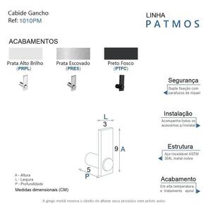 O cabide da linha Patmos possui um design atemporal e discreto, é uma peça de requinte que se destaca com glamour no seu banheiro. Além de decorar, organiza com funcionalidade o banheiro. Criado em aço inox com uma qualidade que abrange áreas litorâneas e possui a de um acabamento muito resistente. Agora é só você adquirir este lindo acessório e fazer o seu projeto se tornar realidade com um banheiro prático para toda a sua família. Características Fabricado em metal aço inox. Disponível no Prata Alto Brilho, Escovado e Preto Fosco. Pode ser instalado em parede, azulejo e porcelanato. Benefícios Fixação prática e segura com parafusos e buchas inclusos. O produto não possui nenhum detalhe em plástico ABS . Fácil higienização, ideal para locais que exigem limpeza constante. Aproveitamento inteligente do espaço, ideal para ambientes compactos. Resistente à corrosão e luz solar. Itens ENVIADOS: 1 cabide, kit de parafusos e manual instrução instalação. Instalação INTELIGENTE Ao 1º furo, use uma broca medida menor, após use a medida correta e finalize, vai ajudar na precisão da fixação da bucha principalmente em azulejos e porcelanato. Marca: Não Informado