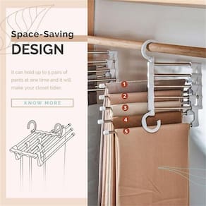 Cabide Retrátil com 5 Níveis – Estrutura em Aço Inox com Ganchos Cabide com estrutura metálica e cinco varetas móveis, desenvolvido para otimizar o espaço em armários e guarda-roupas. Pode ser utilizado na posição vertical ou horizontal, com suporte para múltiplas peças de vestuário.