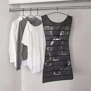Características:Formato de vestido: compacto, leve e práticoMais de 40 bolsos em vinil transparenteMaterial: TNT com acabamento reforçadoIdeal para brincos, colares, pulseiras, broches e outros acessóriosPendure facilmente no guarda-roupa, porta ou araraFácil visualização e organização dos itens