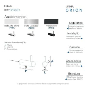 O cabide da linha Orion possui um design versátil, é uma peça que se destaca com minimalismo. Além de decorar, organiza com funcionalidade o banheiro. Criado em metal nobre com uma qualidade que abrange áreas litorâneas e possui a de um acabamento muito resistente. Agora é só você adquirir este lindo acessório e fazer o seu projeto se tornar realidade com um banheiro prático para toda a sua família. Características Fabricado em metal alumínio. Disponível no Prata Alto Brilho, Escovado e Preto Fosco. Pode ser instalado em parede, azulejo e porcelanato. Benefícios Fixação prática e segura com parafusos e buchas inclusos. O produto não possui nenhum detalhe em plástico ABS . Fácil higienização, ideal para locais que exigem limpeza constante. Aproveitamento inteligente do espaço, ideal para ambientes compactos. Resistente à corrosão e luz solar. Itens ENVIADOS: 1 cabide, kit de parafusos e manual instrução instalação. Instalação INTELIGENTE Ao 1º furo, use uma broca medida menor, após use a medida correta e finalize, vai ajudar na precisão da fixação da bucha principalmente em azulejos e porcelanato.