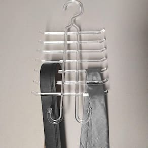 Um cabide para gravatas e cintos é um suporte organizador projetado especificamente para guardar e exibir as peças de forma prática e organizada em guarda-roupas, armários ou closets. Esse cabide é feito de material resistente, que proporciona uma aparência elegante e contemporânea, permitindo que você veja facilmente todas as suas gravatas em um único lugar. O cabide para gravatas possui 16 ganchos dispostos de maneira ordenada, nos quais as gravatas podem ser penduradas individualmente. Com o porta gravatas Cristal, você pode cuidar melhor das suas gravatas, evitando vincos, rugas e danos, prolongando sua vida útil e deixando seu ambiente mais harmônico e organizado.