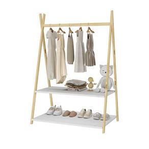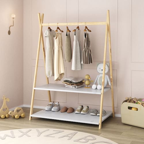 O Cabideiro Infantil Para Crianças Madeira Maciça Danilo possui estrutura em madeira natural e prateleiras brancas, trazendo leveza e um toque moderno para quartos montessorianos.