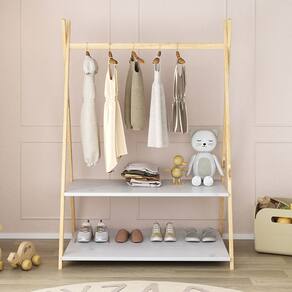 O cabideiro tem altura acessível para pendurar roupinhas com facilidade, e as duas prateleiras permitem organizar sapatos, brinquedos e objetos do dia a dia.