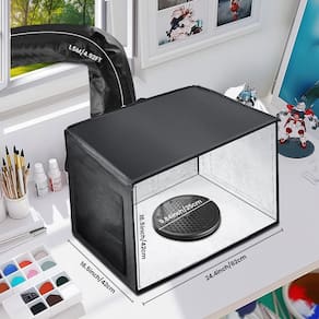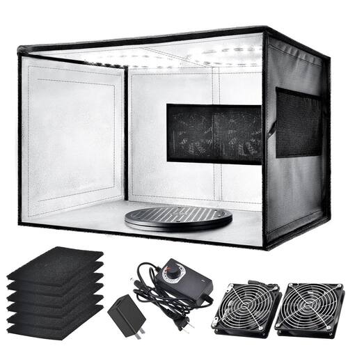Cabine de pulverização de aerógrafo com exaustores duplos, cabine de pintura de aerógrafo portátil para aerografia, 2 luzes LED redondas com cobertura de 360°, toca-discos e mangueira de extensão, kit - ?Maior capacidade para maior funcionalidade? Com um design espaçoso medindo 42 x 42 x 62 cm, nosso produto oferece 2,45 vezes a capacidade dos modelos típicos. Este tamanho maior garante melhor armazenamento, melhor fluxo de ar e maior facilidade de uso - ?Iluminação personalizável e sistema de ventilação com ventilador duplo? LED de anel duplo (reduz sombras) com 3 cores ajustáveis e 10 níveis de brilho + design de ventilador duplo com controle independente e ajuste de velocidade contínuo (0-2800 RPM) - ?Atualização de material?Tecido Oxford (durável e impermeável para uso duradouro), forro de alumínio (impermeável e fácil de limpar) e mangueira de exaustão flexível (cabe em qualquer janela para ventilação versátil) - ?Inclui 6 almofadas de filtro e design leve? Este produto vem com 6 almofadas de filtro e um bolso dedicado para armazenamento fácil e trocas rápidas. Cada acessório tem seu próprio bolso para organização, e o design dobrável com uma alça de tecido o torna apenas 2,9 kg, oferecendo portabilidade sem esforço - ?Fácil de usar, sem preocupações? Simplificamos a configuração com um vídeo de instalação rápida em menos de 30 segundos na página. Além disso, todos os acessórios são modulares, tornando a manutenção, substituição e atualizações sem complicações